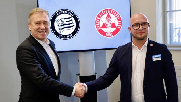 Sturm-Präsident Christian Jauk und GAK-Boss Rene Ziesler Schulter an Schulter. In diesem Falle nicht nur für Fotos, sondern für einen wahrhaftigen Schulterschluss. „Ein historischer Tag“, wie es Jauk nannte. „Beide Vereine arbeiten an einem gemeinsamen Ziel und das sehr konstruktiv.“